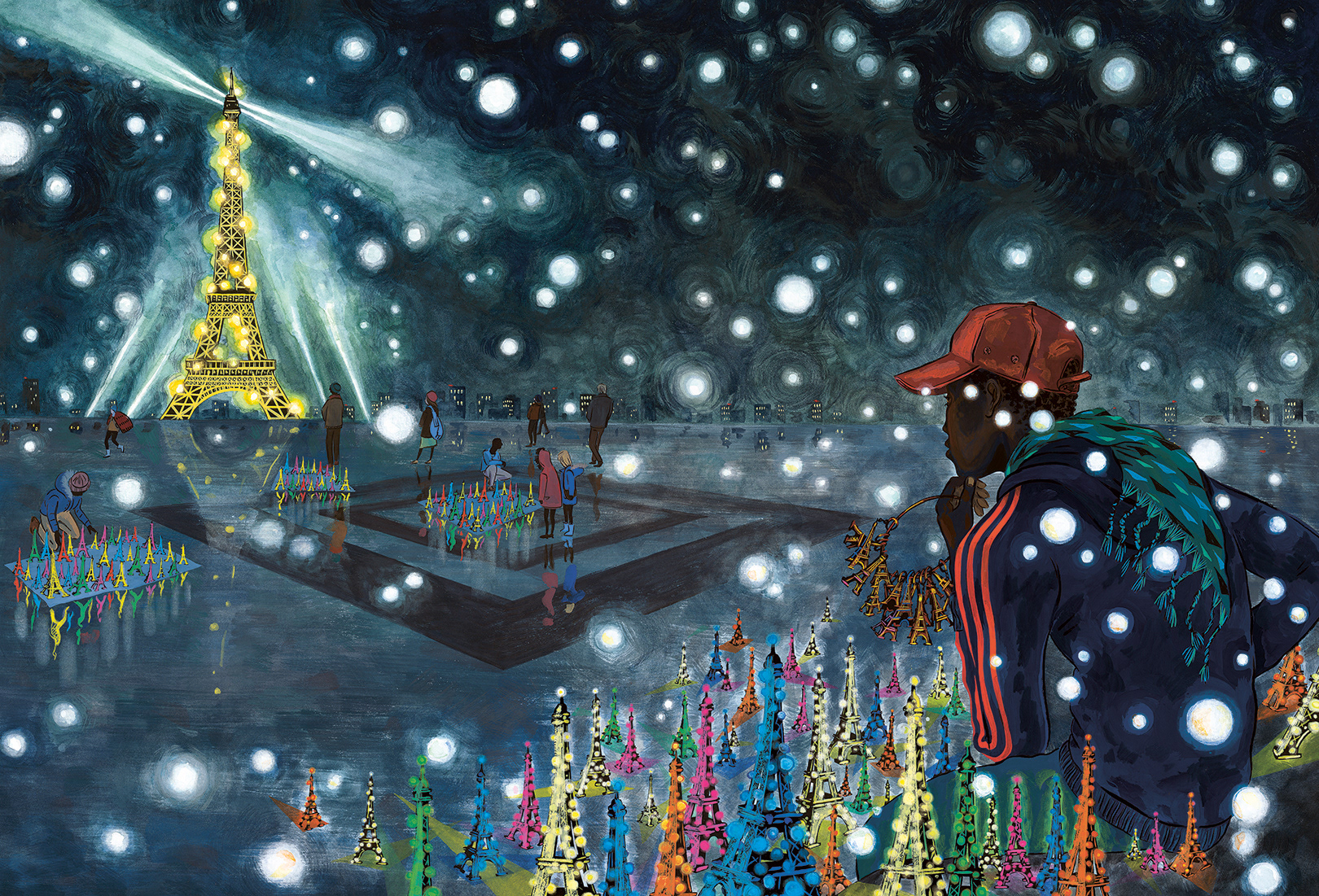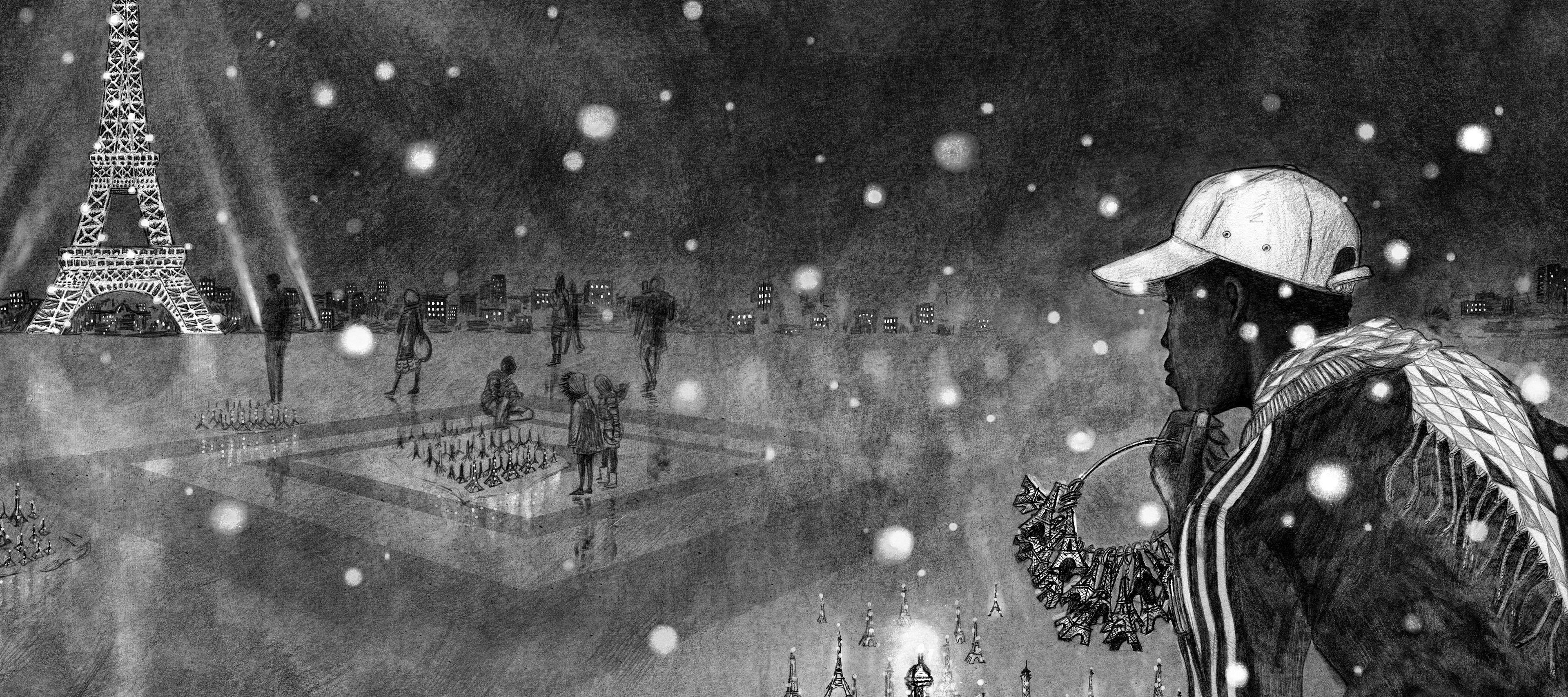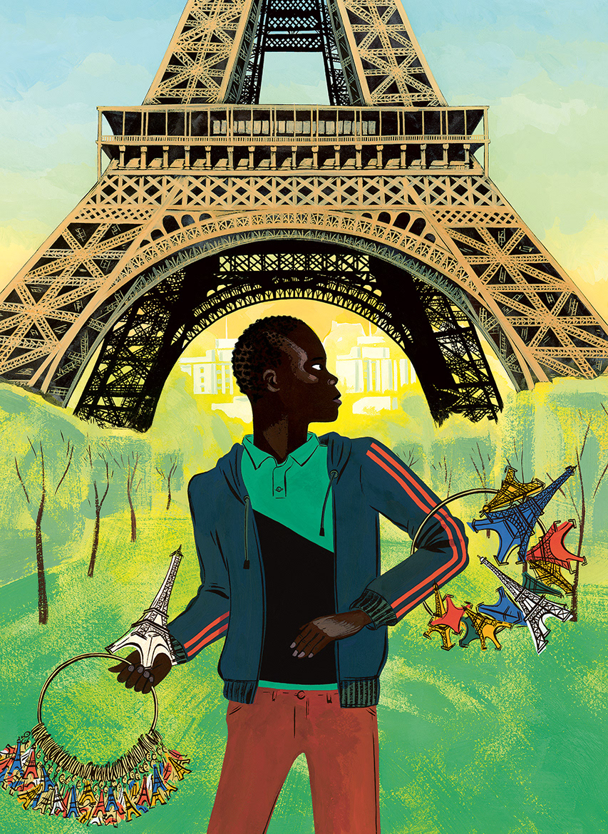 Arrivé à Paris au terme d’un voyage éprouvant, Massamba doit s’improviser marchand de souvenirs pour touristes. Quand il découvre, en vrai, la tour Eiffel dont il a tant entendu parler… quel choc ! Devant lui elle s’élance, phénoménale, telle une fusée d’acier qui transperce les nuages. Vendre des tours Eiffel miniatures sous la grande : au début, il trouve ça trop fort. Mais il doit rester aux aguets…